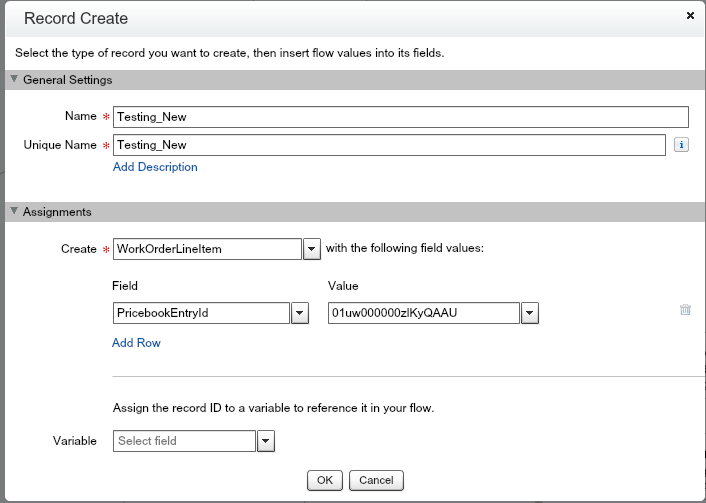 The flow triggers on creating a Work Order record with the expected Record Type and PriceBook but it fails to create the third record. The field I chose in the third record is the same as that in the second record.
