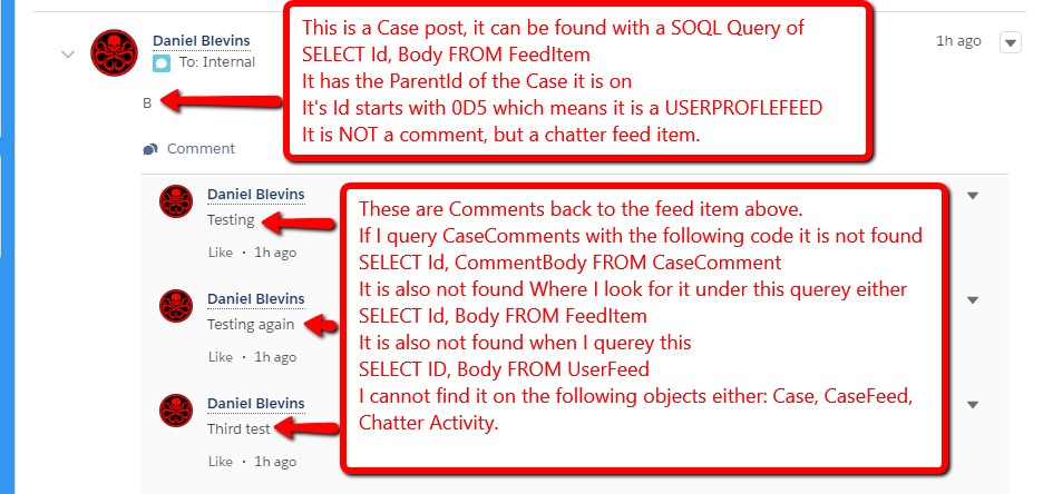 When someone COMMENTS on a POST in a CASE where do I find this Comment? I am trying to create some kind of workflow or process that updates another field when a post is made and that I have accomplished, but I need it to happen when these COMMENTS are left on posts as well but I cannot find where they are located and how to fire off of them. I have been looking for it via SOQL and cannot find the home of these things, I can find the post as FeedItem easily but I cannot find the Comments under it and how I relate them back to their Parent and the Case itself.