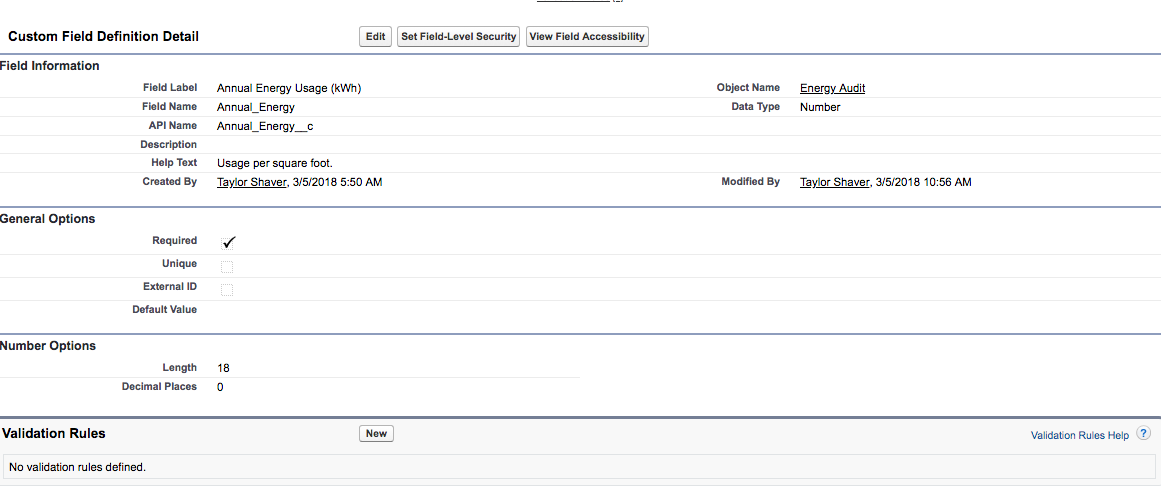Getting an incomplete message which states: "Could not find the 'Annual_Energy_Usage_kWh__c' field on the custom object named 'Energy_Audit__c'."