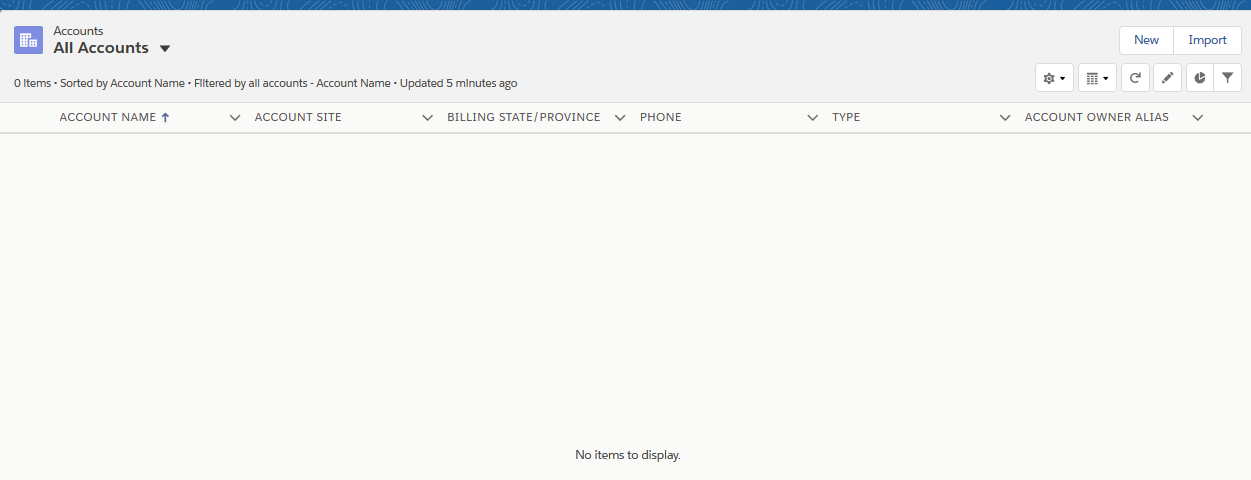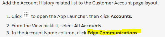 Hello all. I am working through the module called Customize a Salesforce Object, and am trying to complete the section on Enable Account Field History Tracking. I am at the part where it asks to locate Edge Communications, but when I follow the steps, this does not appear - I don't have any Accounts.