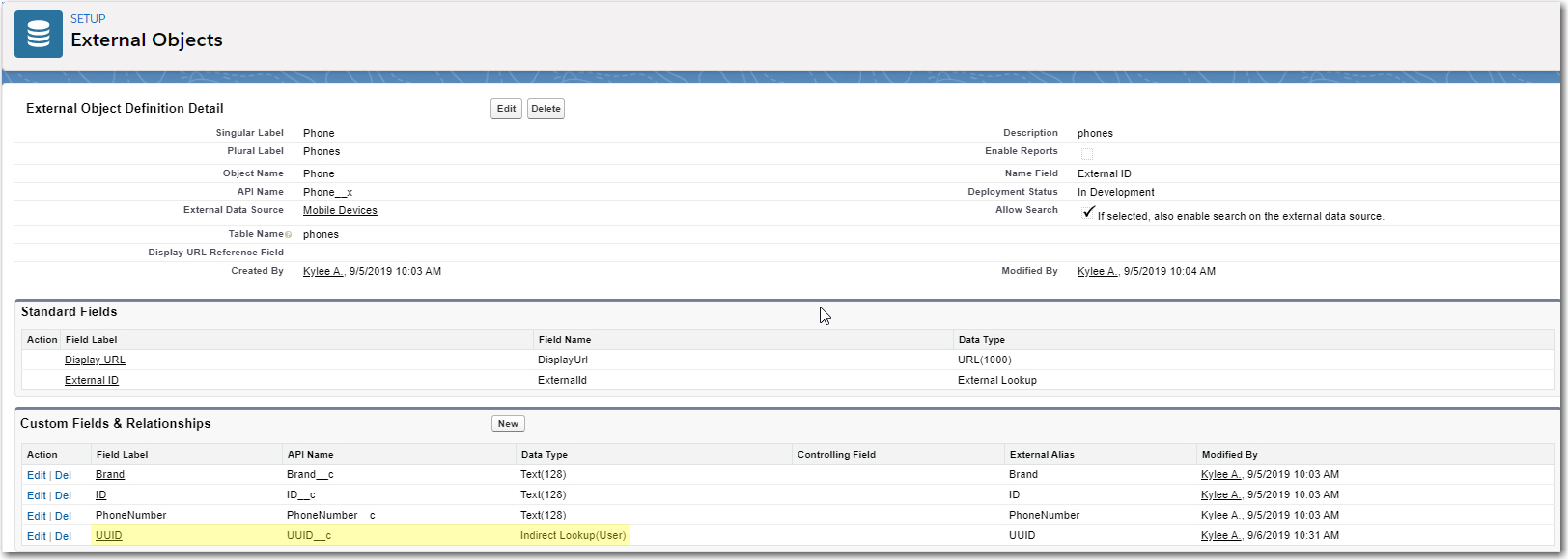 Change the 'UUID' field on the 'Phone__x' external object to be an indirect lookup relationship to the 'User' standard object. Use the 'Phone_UUID__c' field as the matching key for this indirect lookup relationship.
